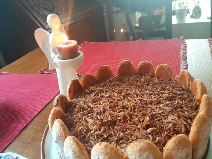 - Piškóty, ktoré budete potrebovať na okraj torty, prekrojte na polovicu (aby neboli moc vysoké). Tortová forma by mala mať priemer okolo 24cm. Namáčajte jednu stranu piškót do čajového sirupu a ukladajte vertikálne po okraji tortovej formy.