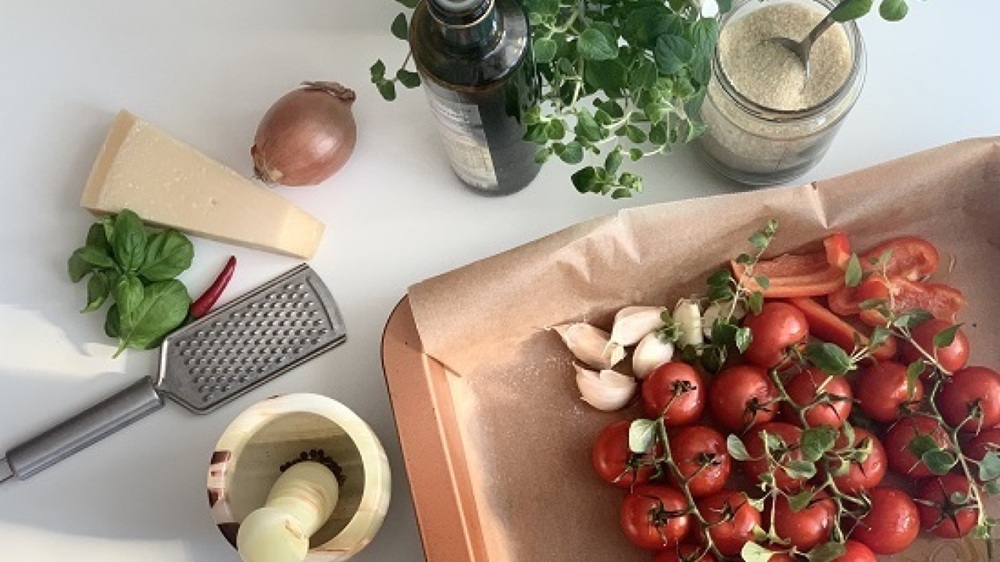 Na úvod si paradajky umyjeme v sitku a ak sa dá, ponecháme stonku. Červenú papriku umyjeme, nakrájame a zbavíme semienok. Tá dodá polievke červenú farbu i sladkú chuť. Plech potrebujeme hlboký, prípadne použijeme jánske sklo. Môžeme použiť aj papier na pečenie alebo alobal na spodok plechu. Paradajky totiž pustia dosť šťavy, ktorá nesie v sebe mnoho chuti a práve tú použijeme do polievky. Paradajky aj nakrájanú papriku uložíme na plech. Pridáme k nim 6 strúčikov neošúpaného cesnaku a stonky čerstvého oregana alebo rozmarínu. Polejeme olivovým olejom a dáme piecť na 25-30 minút na horkovzduch na 180 stupňov. Necháme piecť a po 20 minútach pokračujeme v príprave.