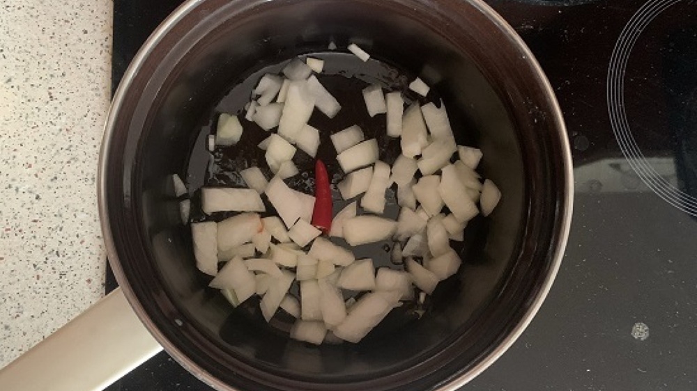 2. Cca 10 minút pred ukončením pečenia paradajok s cesnakom a bylinkami si začneme na oleji restovať nakrájanú cibuľu s celou chilli papričkou. Ak nemáme radi pikantné, pokojne vynecháme, prípadne použijeme menšie množstvo. Restujeme na olivovom oleji na miernom ohni, aby sme ho neprepálili. Ku koncu pridáme cukor a necháme ho jemne rozpustiť.
