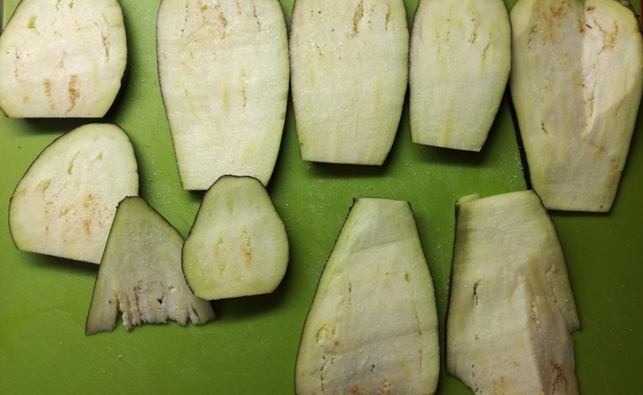 - Na začiatok nakrájame baklažán na tenké približne pol milimetrové plátky, položíme ich na podložku, osolíme a necháme 10 min „vypotitť“, aby baklažán nebol horký. To isté spravíme aj z druhej strany.