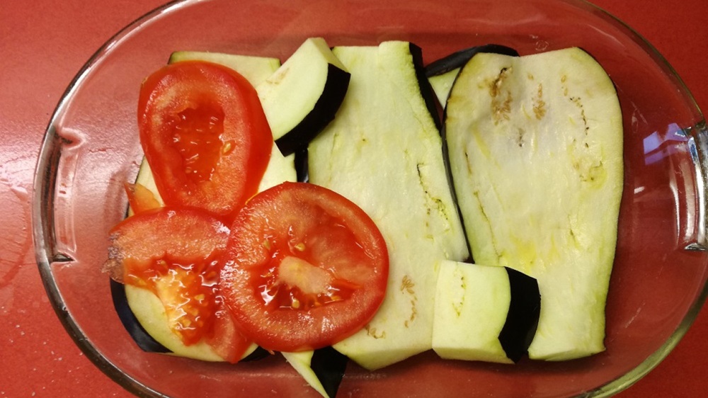 3. Vezmeme zapekaciu misku, poukladáme do nej plátky baklažánu. Na vrch položíme takisto na tenko nakrájané paradajky a mozzarelu. Keď máme mozzarelu poukladanú, použijeme časť paradajkového pretlaku.