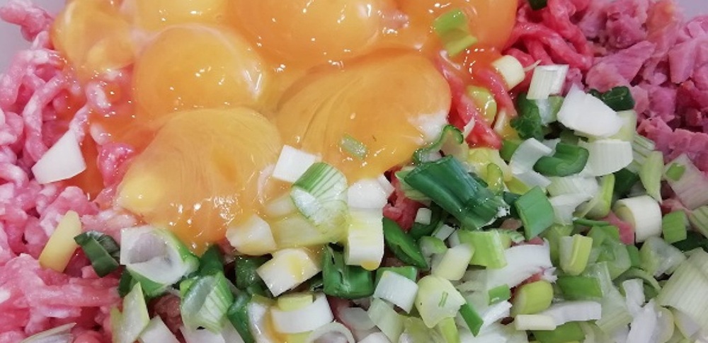 Mäso si pomelieme. Na prípravu môžeme zvoliť aj hovädzie mäso, ktoré zmiešame s bravčovým. Do väčšej misky pridáme pomleté mäso, aj údené, žĺtky, nakrájanú jarnú cibuľku (obľúbené bylinky).