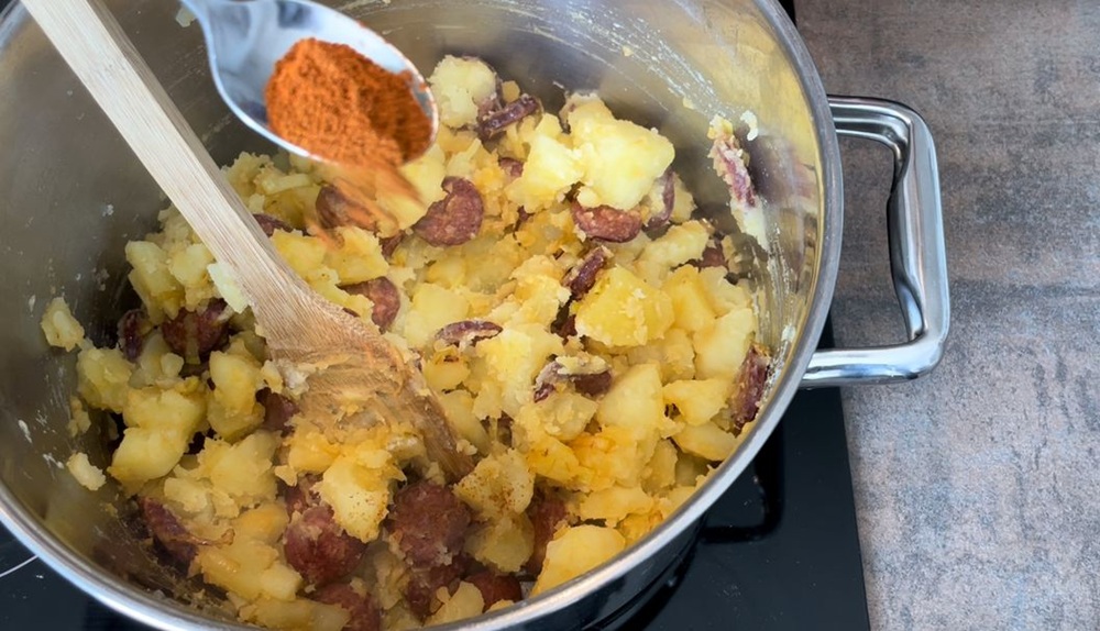 4. Zmes okoreníme – pridáme soľ a červenú papriku. Podľa toho ako je korenená klobása, môžeme aj čierne korenie.